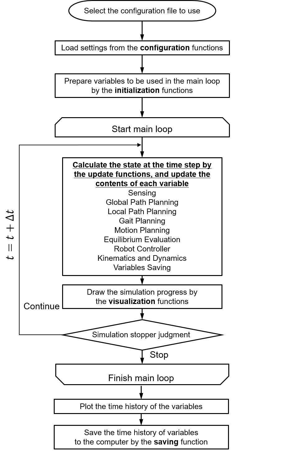 まずConfiguration関数で各種設定を読み込み,これからおこなうシミュレーションの設定をおこなう.この処理により,どんなロボット・地形・環境・経路計画・歩容計画・運動計画・制御手法を適用するかが決定される.次に,Initialize関数により,シミュレーションループを開始するために必要な全ての変数を用意し,それらの変数に対して初期状態を設定する.厳密には,メインループのシミュレーションが時刻0秒から始まるため,Initialize関数では時刻0 - Δt 秒の状態が設定されるイメージである.Initialize関数によって初期状態が設定されたため,その状態を起点としてタイムステップΔt 秒毎に離散的に時間を進めて計算し,各変数の値を更新(Update)していくことで,歩行シミュレーションをすすめることができる.メインループ内では計算処理に加えて,シミュレーションが進んでいる様子を確認するために,Visualize関数によってその時のロボットの状態などを画面上に表示させる.そして,各タイムステップにおいて,シミュレーションの終了条件を満たしているかを確認する.シミュレーションは,以下の条件: